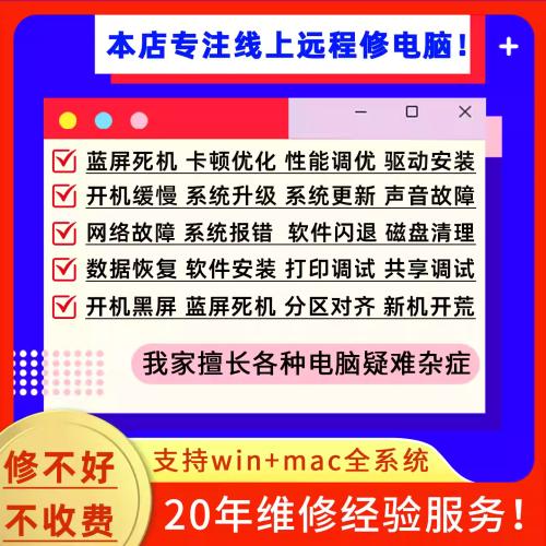 电脑远程维修店问题在线解决蓝屏笔记本重装wi11系统修复技术服务