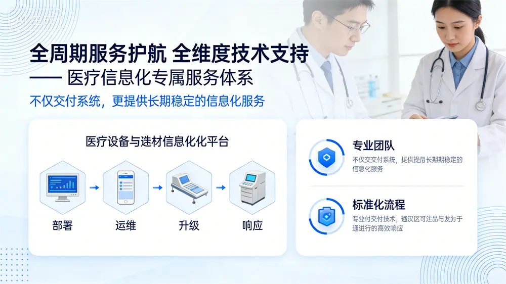 秉持 **“不仅交付系统,更提供长期稳定的信息化服务”** 核心理念,围绕医疗设备与耗材信息化平台全生命周期,打造覆盖部署、运维、升级、响应的一站式服务体系,以专业团队、标准化流程、高效响应为医疗机构保驾护航,确保信息化系统稳定运行、价值持续释放。